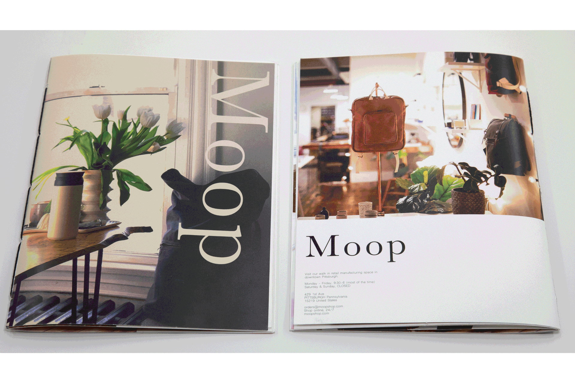 The objective of this project was to rebrand Moop, a handmade leather bag company in Seattle, Washington. I created this product catalog/care guide as the primary component of the final products, as well as a postcard, website, and style guide.